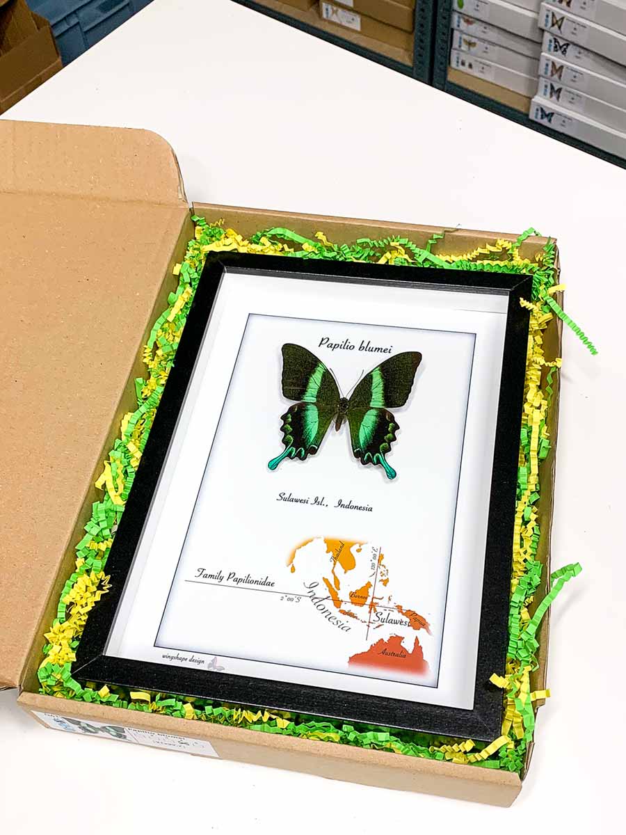 Poznámka: Každý exemplář motýla je trochu jiný a motýl, který Vám bude doručen, se může mírně lišit jak barvou, tvarem, tak způsobem preparace. Mírné nedostatky, případně lehké setřeniny na křídlech jsou přírodního charakteru a nejsou známkou zhoršené kvality.